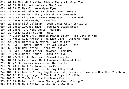 Hier finden sich meine gesammelten Compilations aus den Blogeinträgen (ohne die Begleittexte). Bei Klick auf die Zeile unter dem Mixcloud-Player öffnet sich die Tracklist.